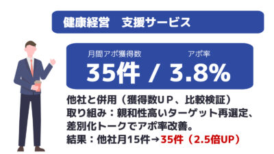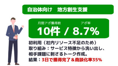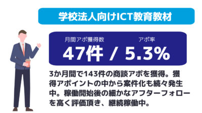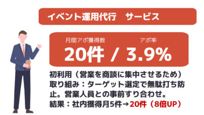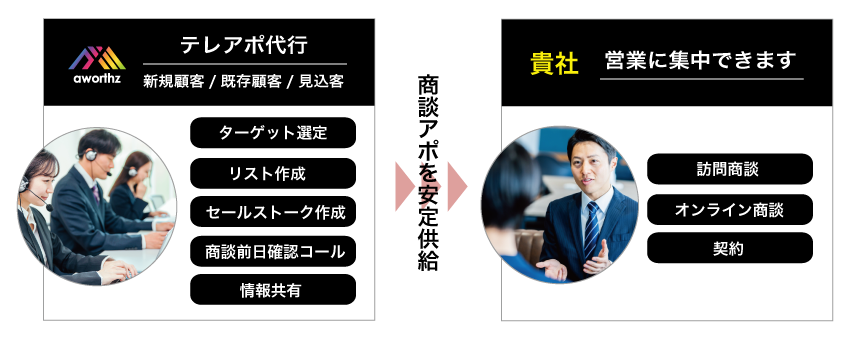 貴社は、商談アポイントへの営業だけに集中でき、営業効率&成約率アップにつなげて頂けます。